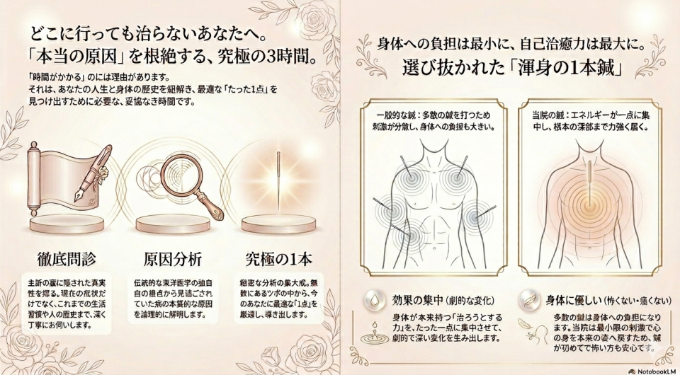しかし、この初診3時間、鍼1本には、とても重要な意味が込められております。その理由を動画にまとめておりますので、ぜひご覧いただけると幸いです。