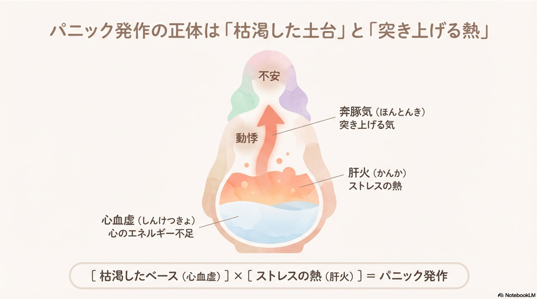 パニック発作のメカニズムを東洋医学的に図解したものです。